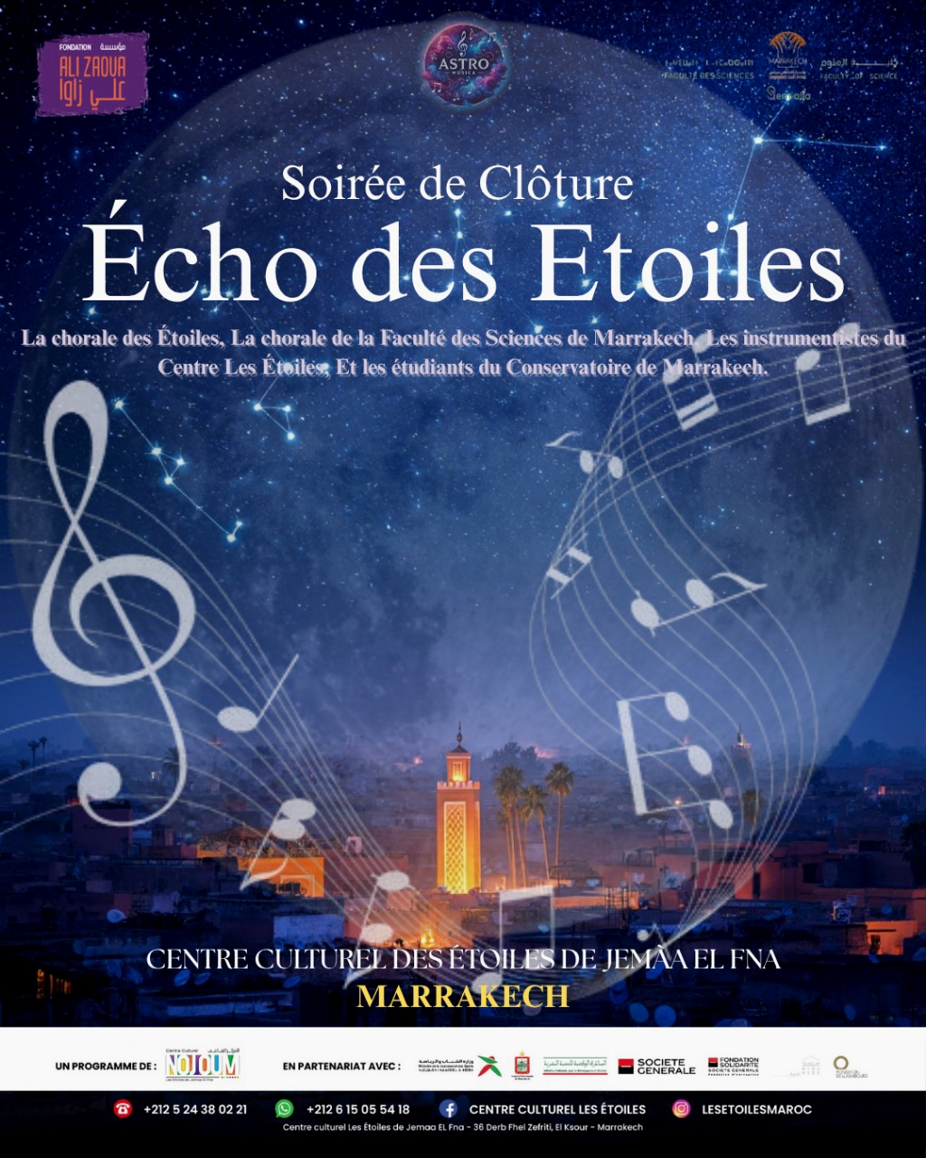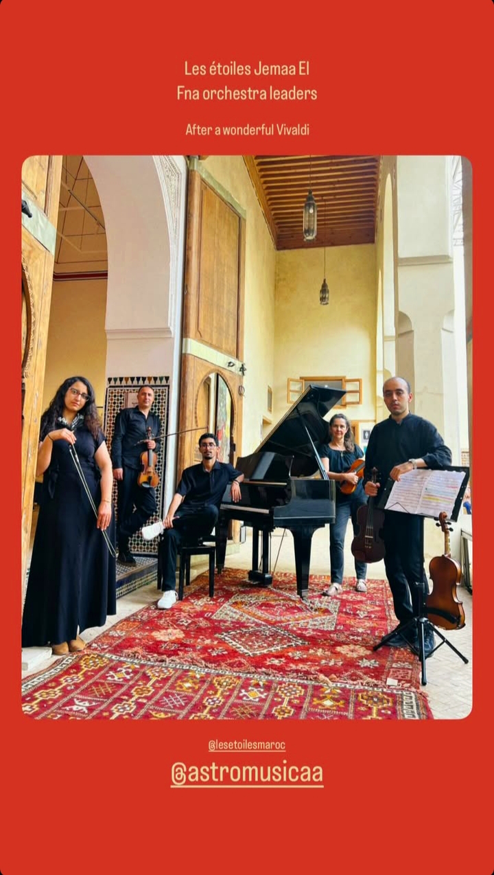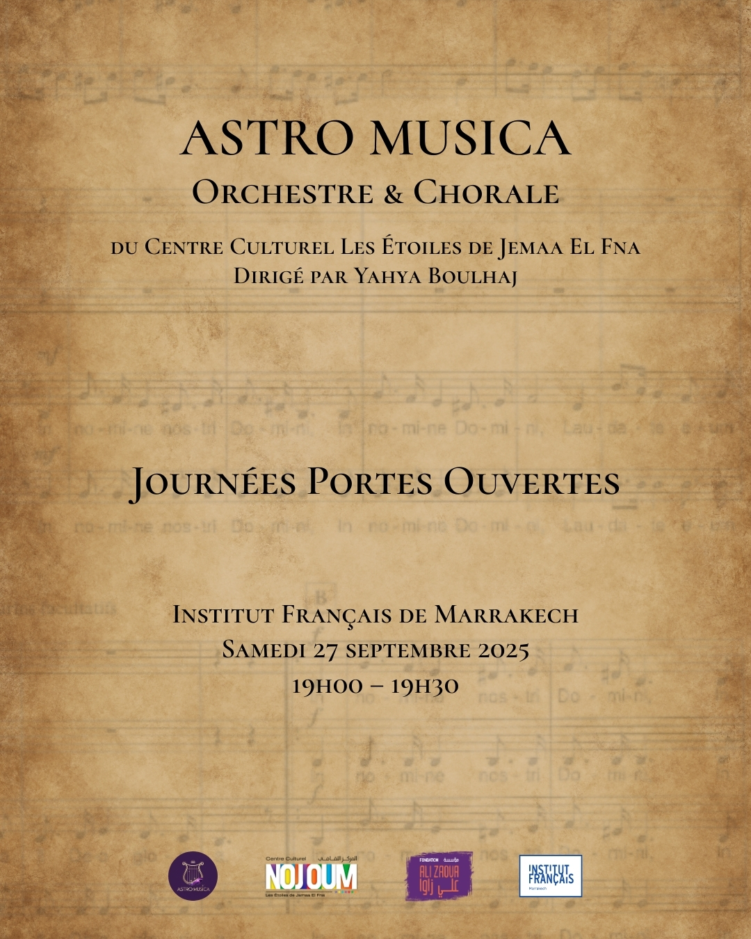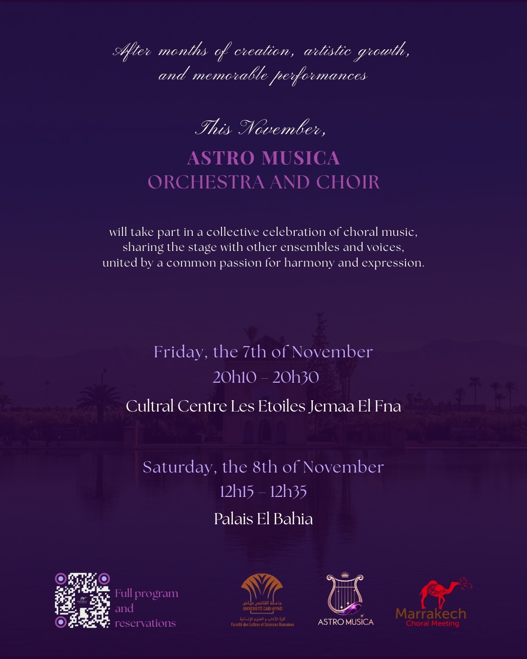 Nos événements ne s’arrêtent pas aux applaudissements. Nous organisons régulièrement des Masterclasses, des ateliers ouverts et des répétitions publiques pour permettre aux curieux et aux passionnés de découvrir les coulisses de la création. Pour Astro Musica, chaque événement est une occasion de plus de faire rayonner la culture à Marrakech et d’inspirer la nouvelle génération d’artistes.